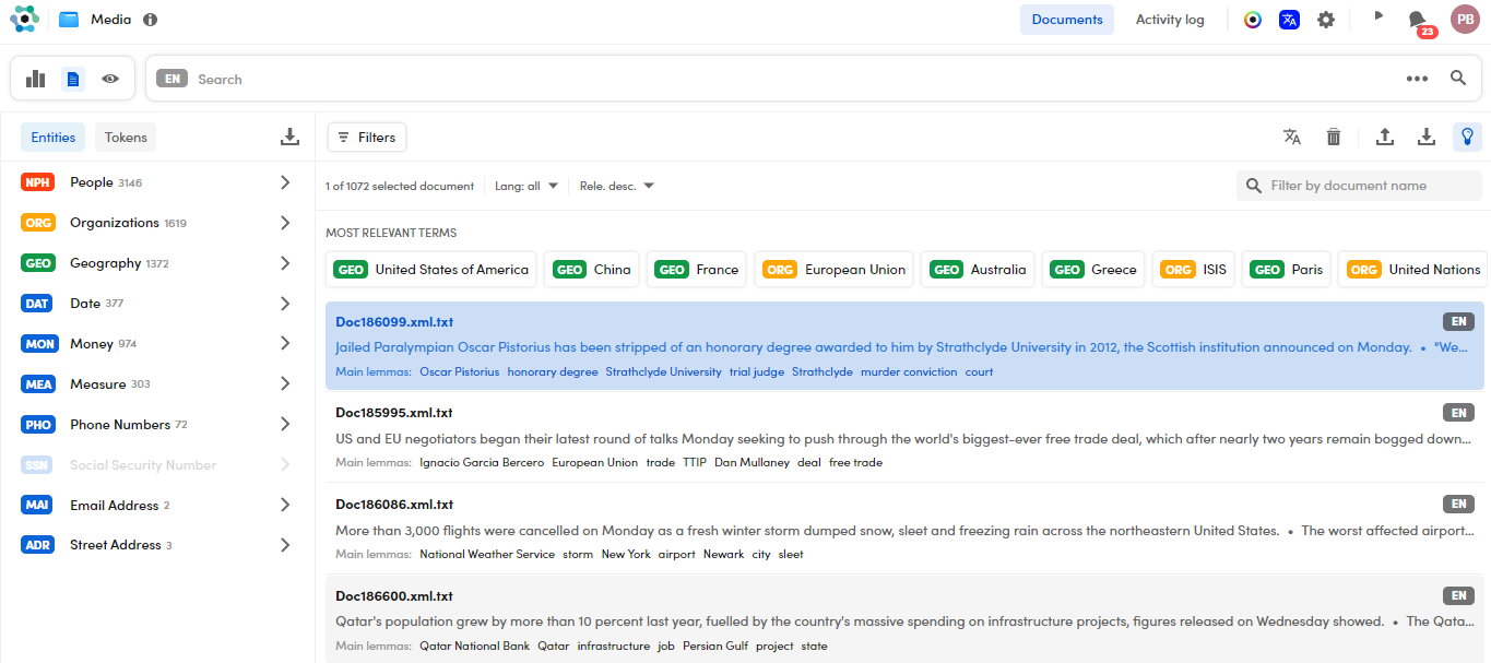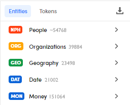 In the Entities tab you find an item for each named entities type or group of types. For example, Geography and Organizations are groups of types: the former includes buildings and environments, the latter companies and mass media.