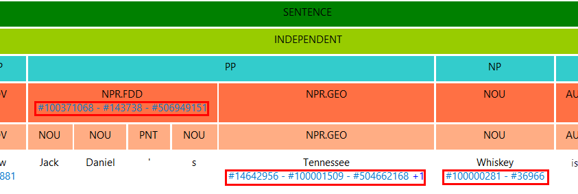 When the underlying text is also recognized as a named entity (for example person name, a geographic place and so on), the entity type abbreviation is appended to the word class abbreviation, separated by a dot. For example, NPR.NPH is the label for a tile corresponding to a proper name that's also person name, like John Smith.
