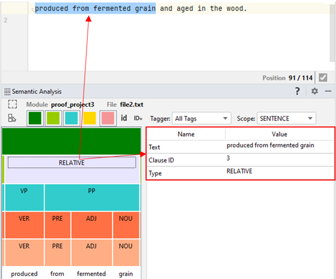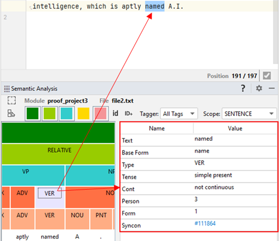 • In case of multiple tags on a token, the tag with the highest level will appear in the analysis area on the left.
