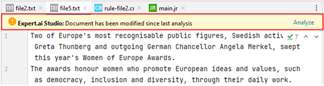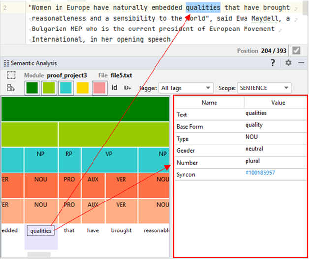 After the analysis of a test document, the combined outputs of deep linguistic analysis (also called disambiguation) and tagging are shown in the Semantic Analysis tool window.