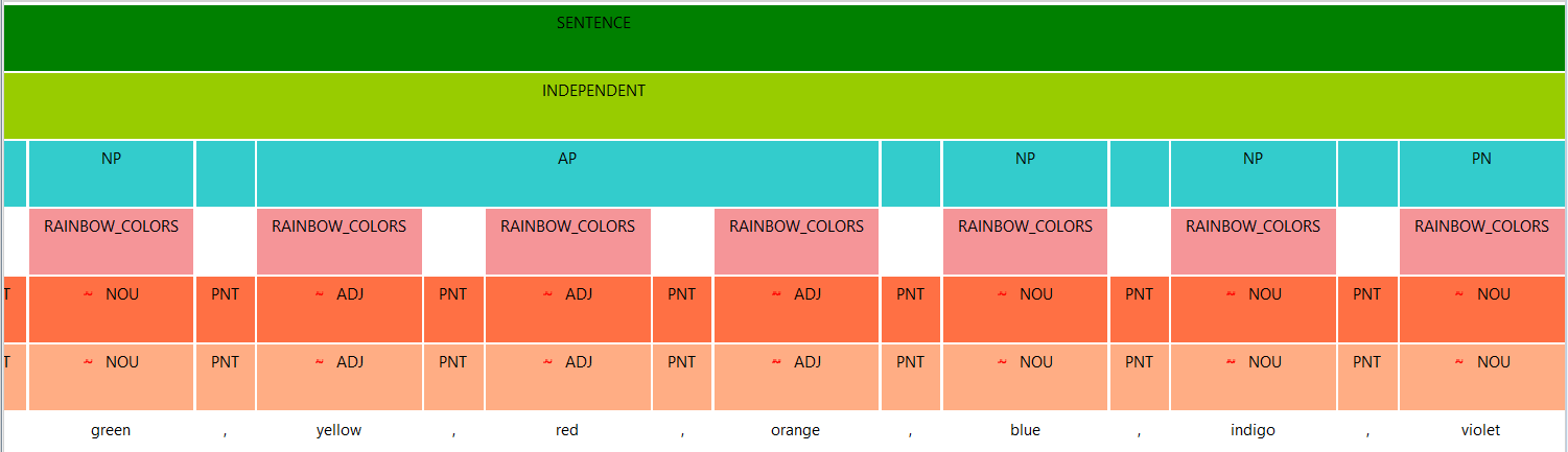 The results of the deeep linguistic analysis and tagging are represented by layers of colored tiles, which, from top to bottom, correspond to output elements of increasingly finer granularity.