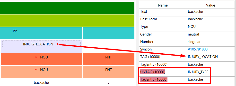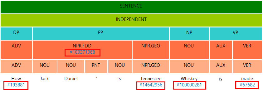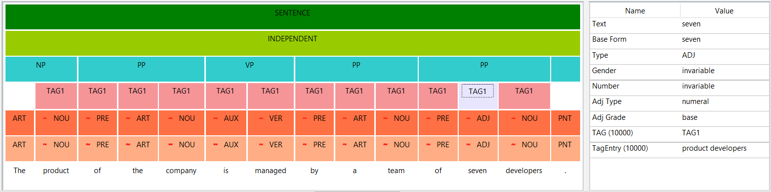 The tags (color: pink ) that were superimposed—either by tagging rules or by the script—to the deep linguistic analysis output are recognized by.