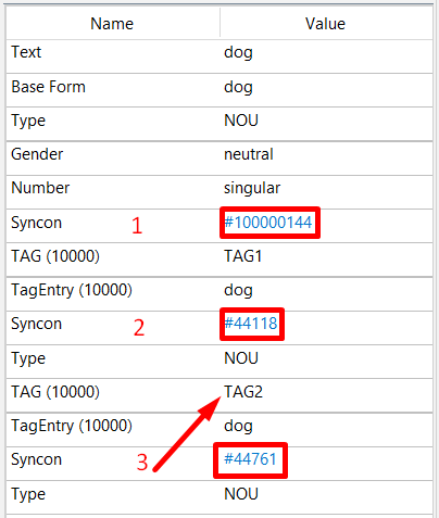 and two different tagging rules, both syncons will appear and the token will be linked to each one of them in the detail panel on the right.