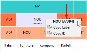 You can show the syncon IDs inside text elements tiles (white layer) and, for collocation, word tiles (tomato) that correspond to knowledge graph concepts identified by the disambiguator.