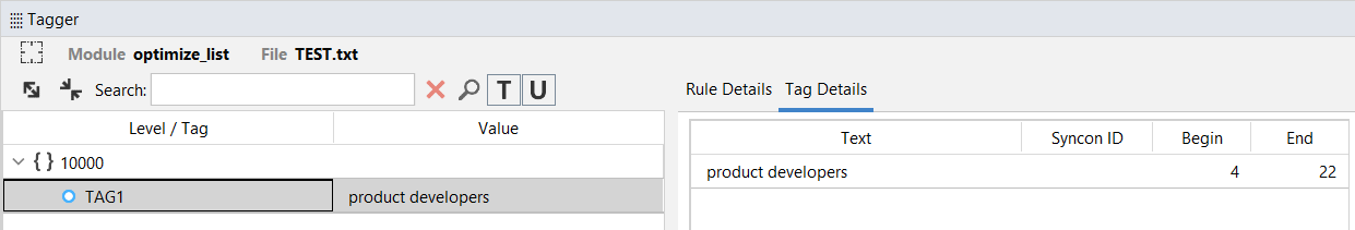 even though there are more tiles, there is only a single tag in the Tagger tool window with a character extension spanning from product to developers corresponding to a range of characters from 4 to 22.