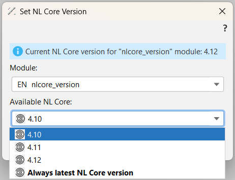 This is what you see if you select Always latest NL Core version: