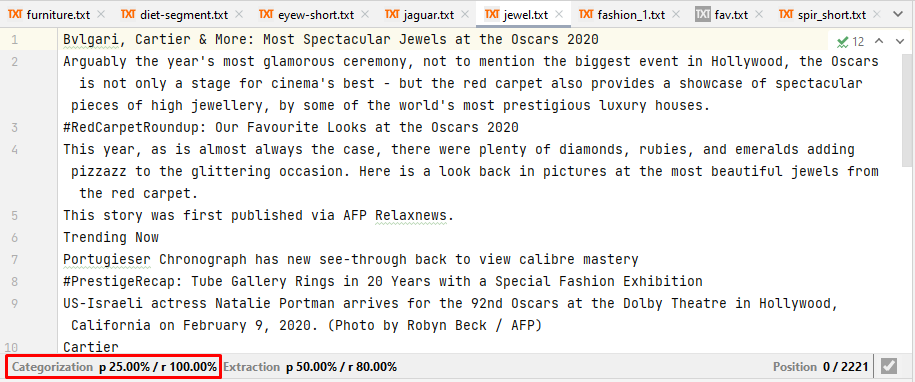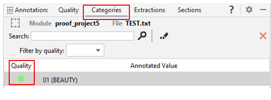 To check the quality of your project's categorization, you must first set the target results, that is, you must "explain" to Studio what you expect from the categorization of test document. This is accomplished by annotating target categories for test documents.