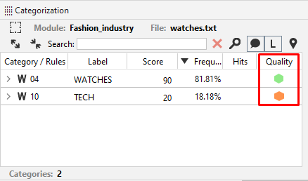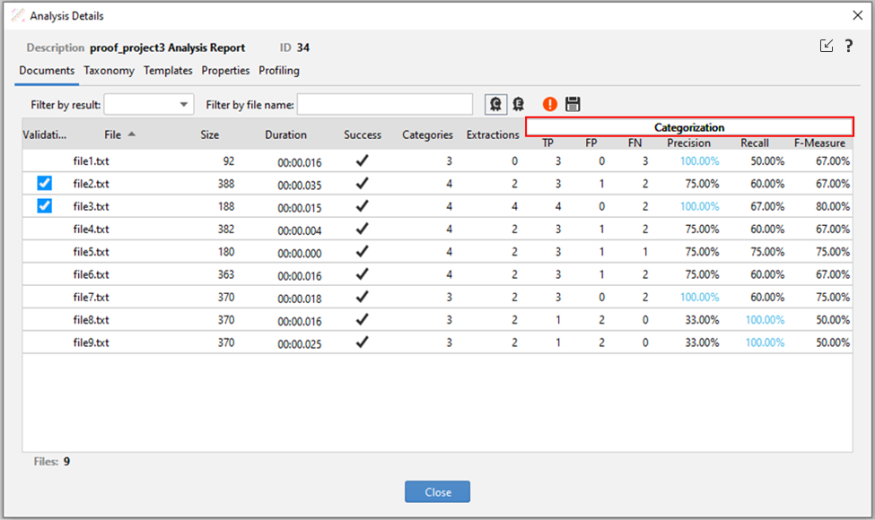 To turn indicators on and off, in the Analysis Details window, Documents tab, select Categorization Quality Data