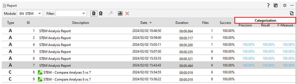 It is shown as a table in the Report tool window. By default both categorization and extraction indicators are shown.