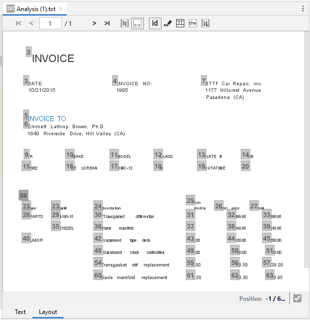 Once a JSON file is prepared following the Prepare Selection command, it is possible to display the resulting PDF-like layout or the plain text file enabling the Document Layout Viewer.