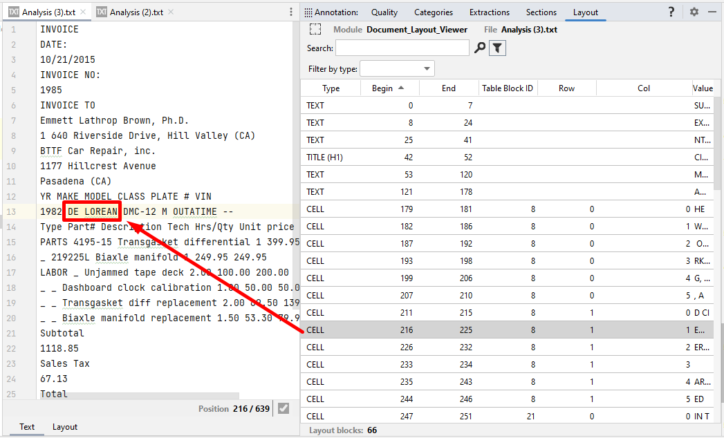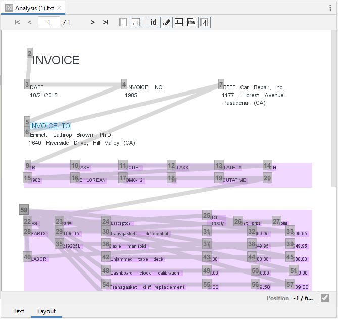 4. Select an annotation in the Layout tab to check the related text portion in the plain text viewer.