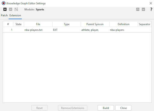 The Knowledge Graph Editor Settings window allows you to extend and patch the project's knowledge graph.