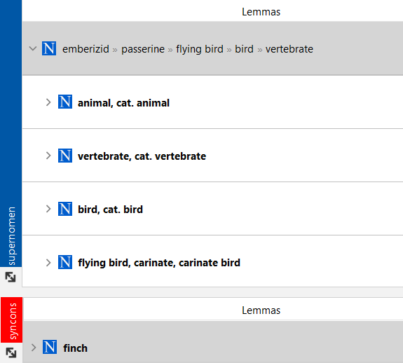 In full hierarchy view mode, instead of the emeberizid syncon, the entire hierarchical path up to verterbrate is shown and, if the ancestry item is expanded, all the syncon along the path plus the root syncon of the hierarchy are shown from the most generic (animal) down to the more specific (emnberizid).