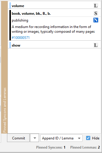 Double-clicking an item—a syncon or a lemma—in the syncons strip acts as a toggle switch to pin or unpin the item itself.