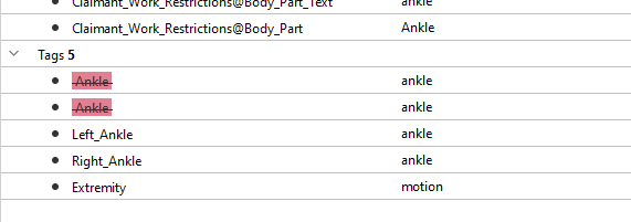 Untags, that is tag instances made negative, are crossed out and have a colored background.