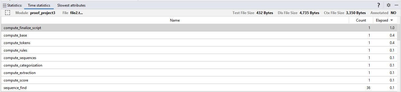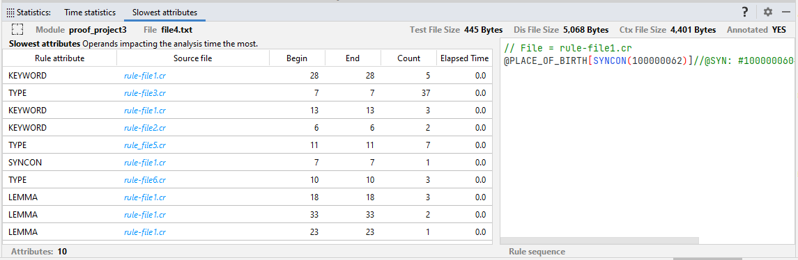 The Slowest attributes tab shows the ten slowest operands affecting file analysis time.