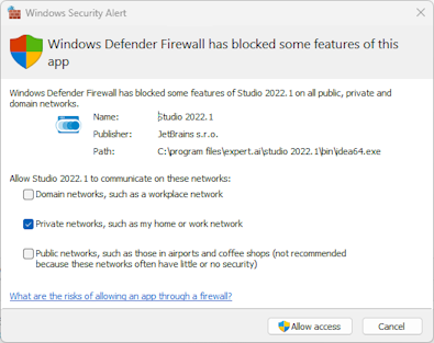 For debugging JavaScript code and using the Local Deployment Agent API, Studio requires inbound TCP/IP connectivity which Windows Defender Firewall blocks by default. If you want to use the aforementioned features, when the Windows Defender Firewall prompt appears while using Studio, allow Studio to communicate on private networks.